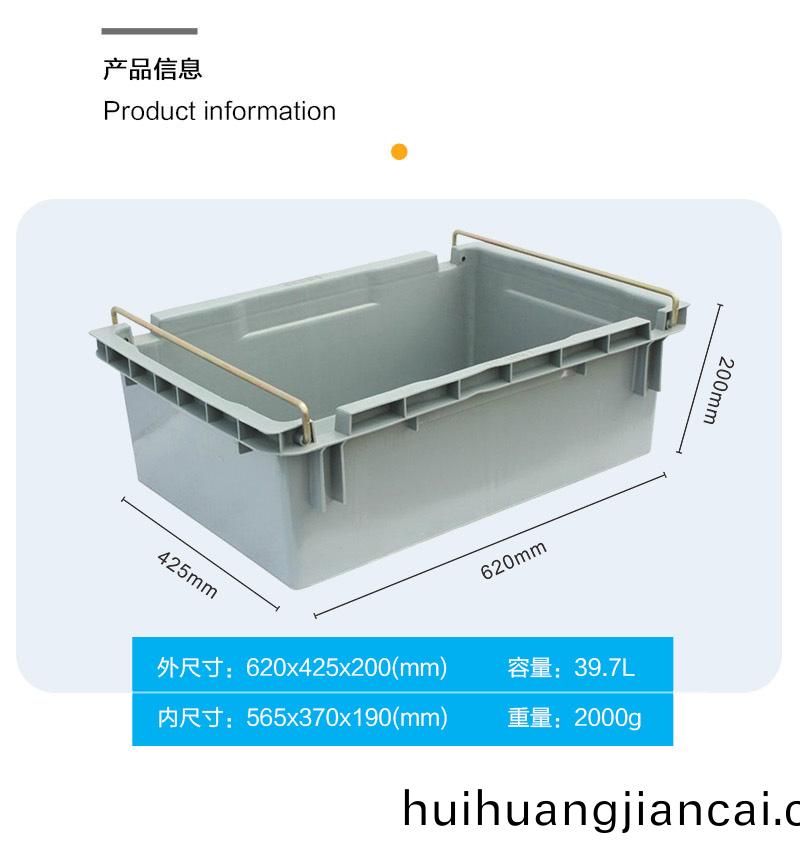 外尺(chi)寸:620*425*200mm 內(nei)尺寸:570*370*190mm 材質:PP 重量:2000g