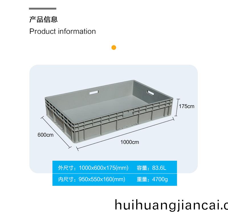 外尺寸:1000*600*175mm 內尺寸:950*550*160 材質:PP 重量:4700g
