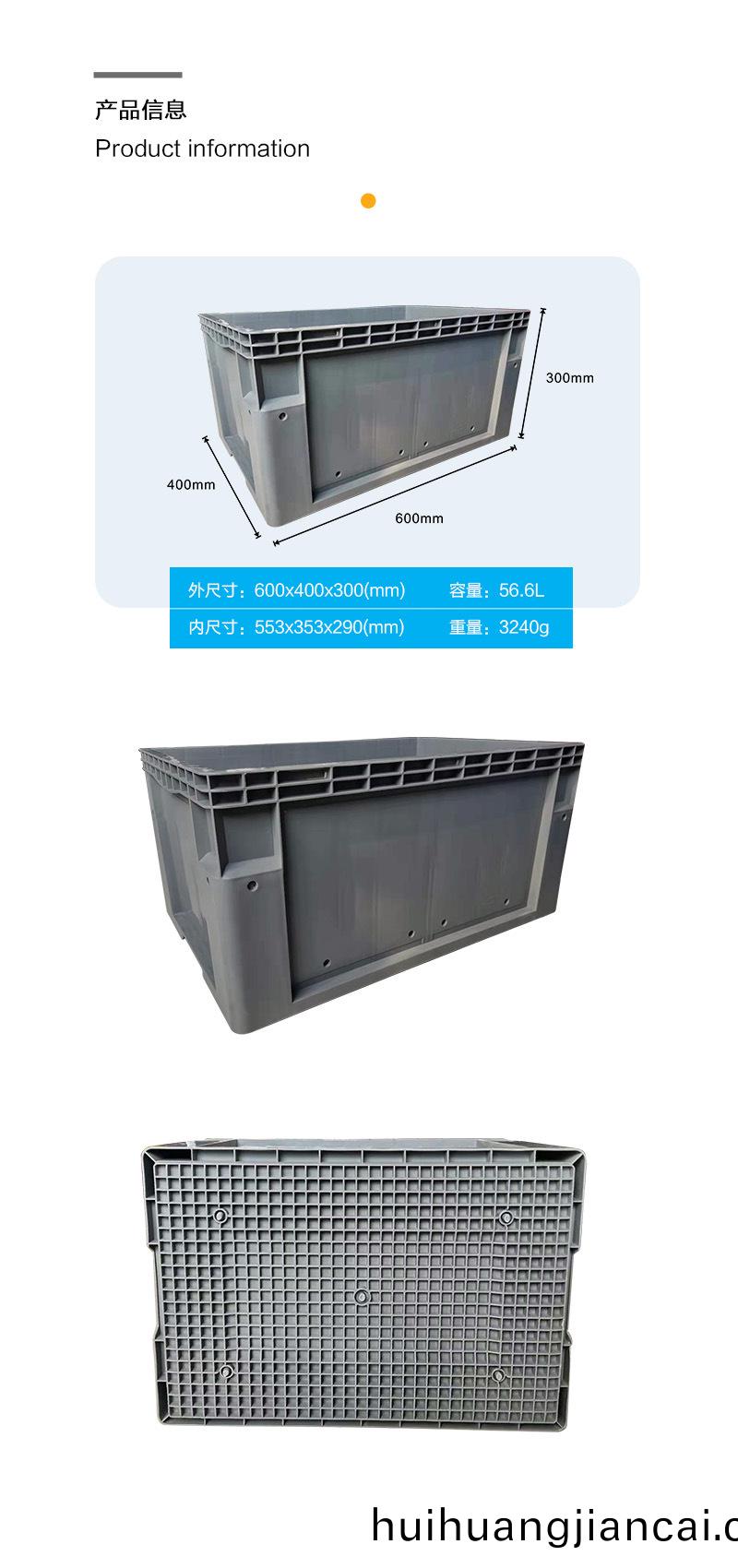 外尺寸:600*400*300mm 內尺寸:553*353*290mm 材(cai)質:PP 重量:3240g