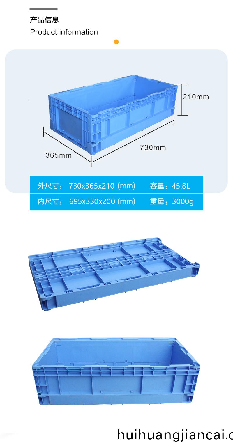 外尺寸:730*365*210mm 內尺寸:695*330*200mm 材質(zhi):PP 重量:3000g