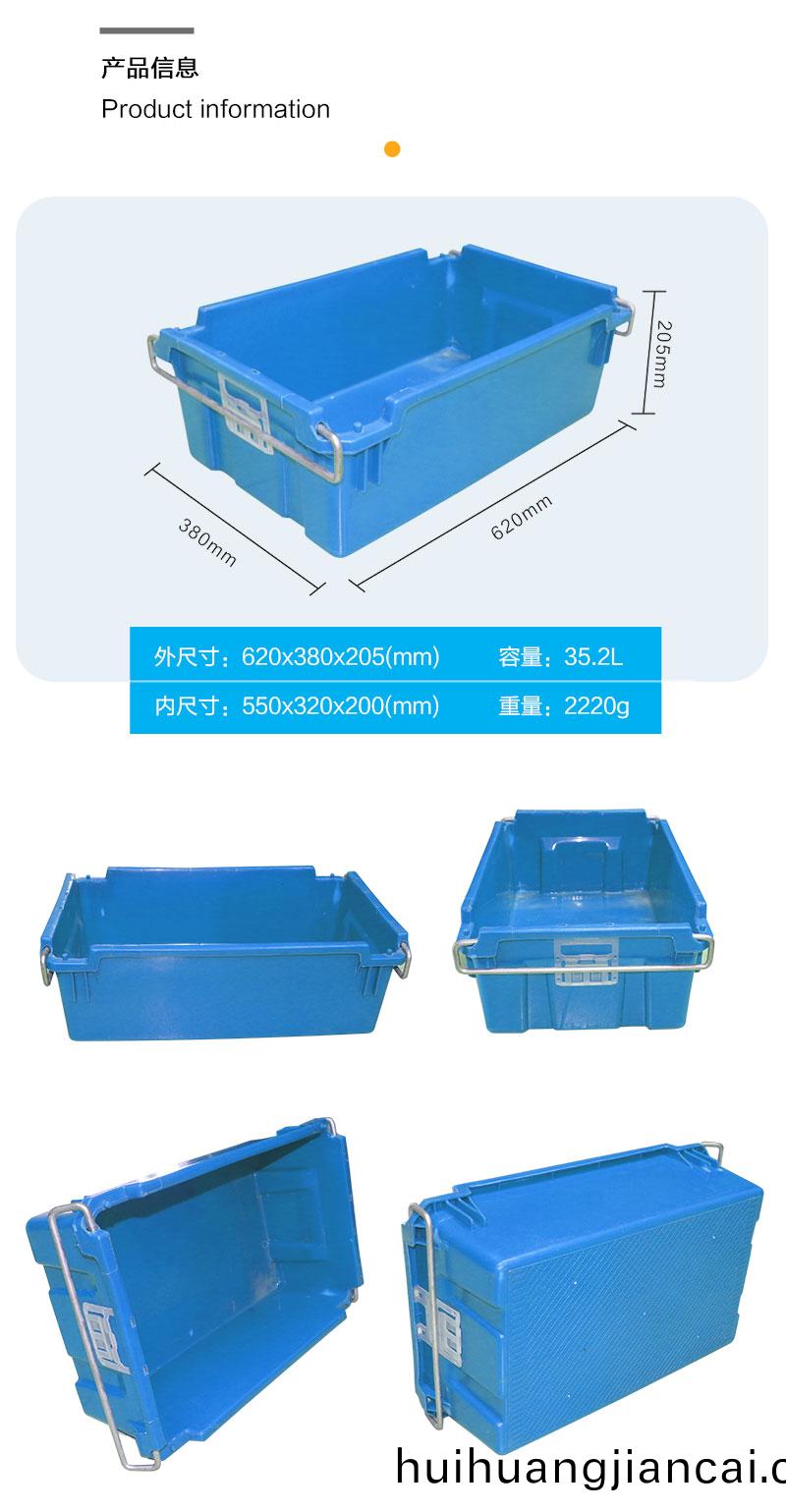 外尺寸:620*380*205mm 內(nei)尺寸:550*320*200mm 材質:抗衝(chong)擊改性PP 重量:1675g