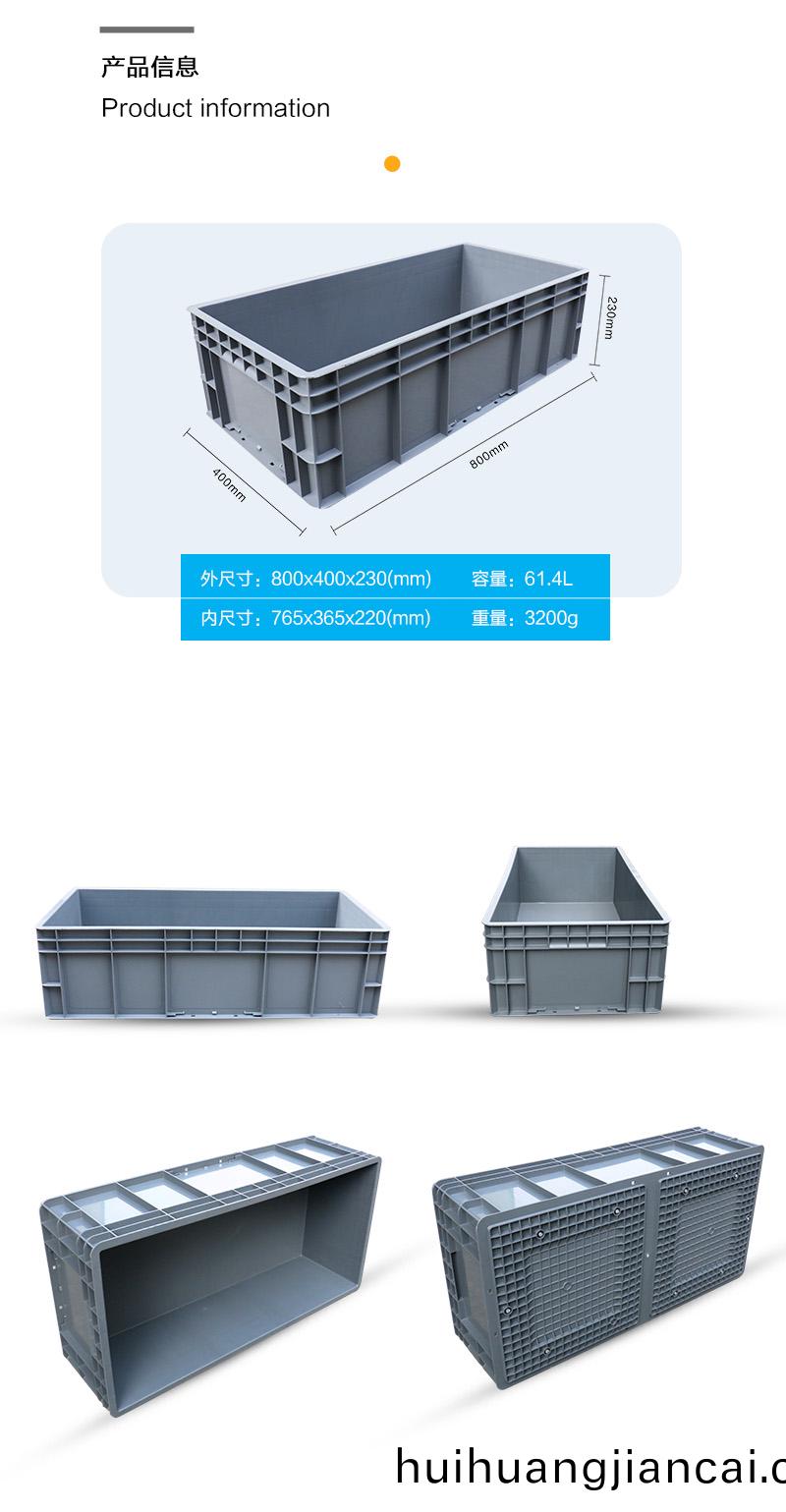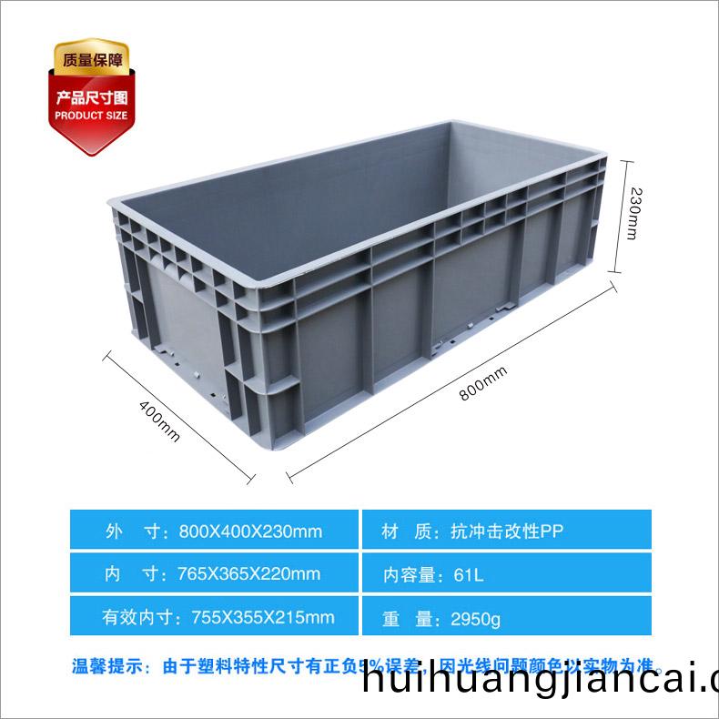外尺寸:800X400X230mm 內尺寸:765X365X220mm 材質:抗衝擊改性PP 重(zhong)量:2.9kg