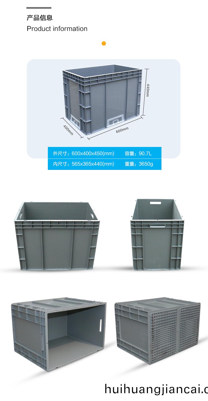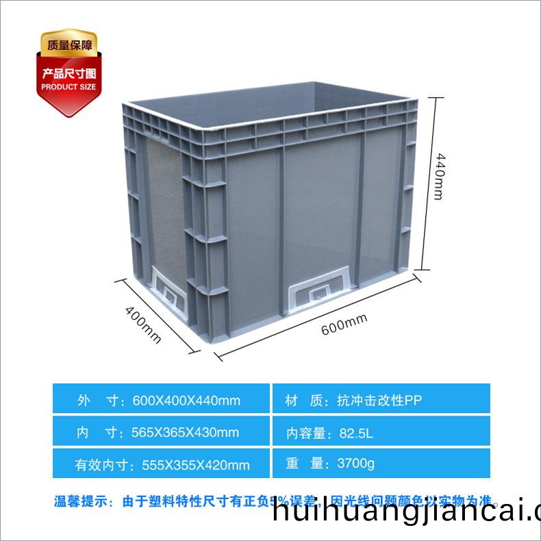 外尺寸:600X400X440mm 內尺寸:565X365X430mm 材質:抗衝(chong)擊改性PP 重量:3.6kg