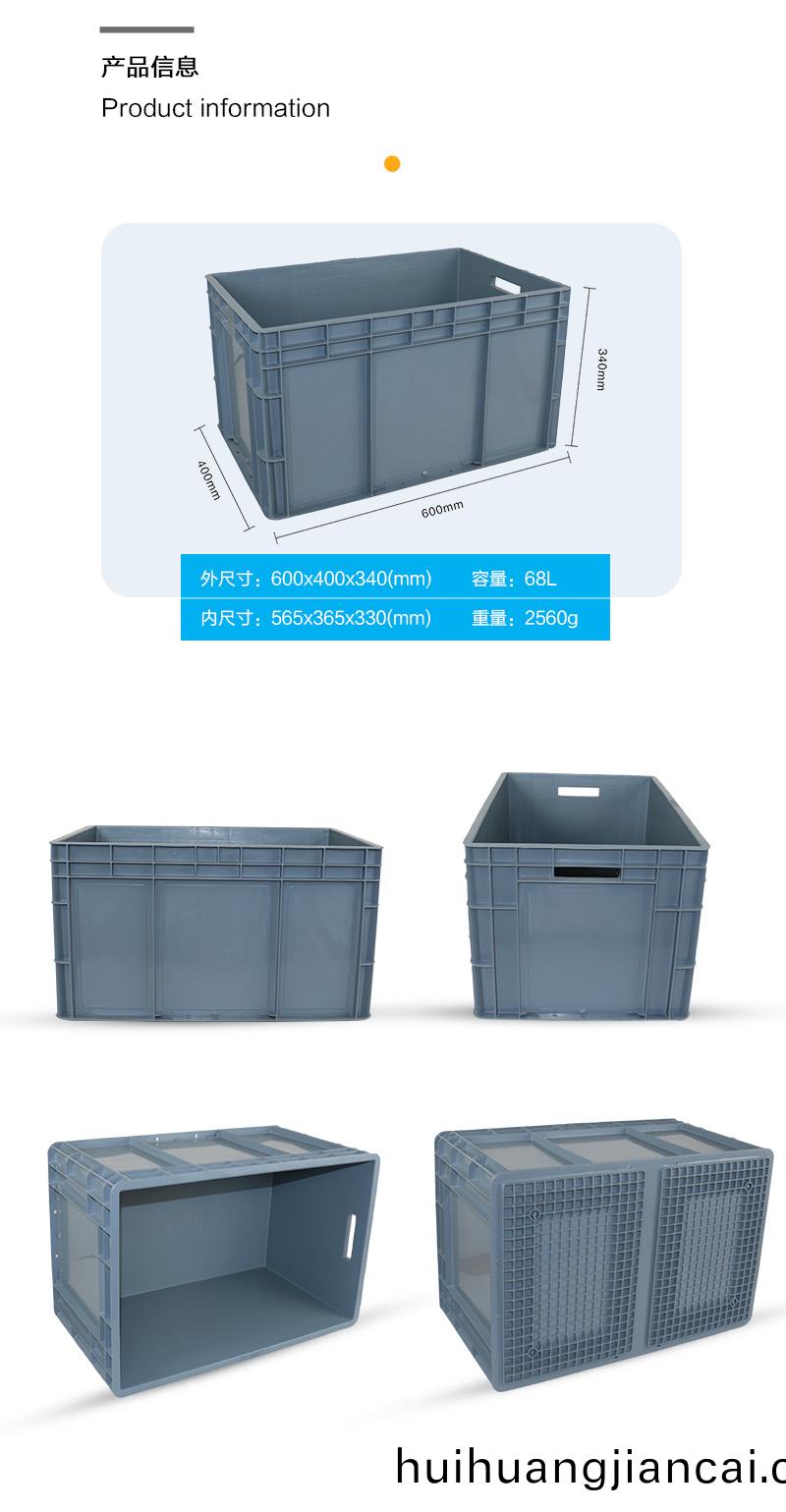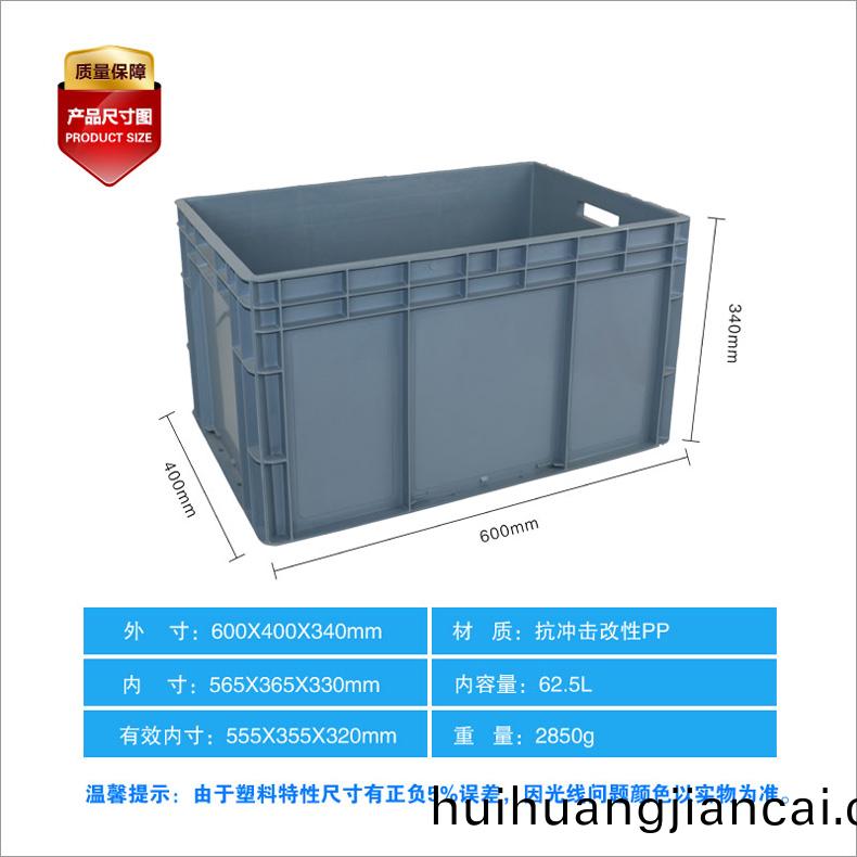 外尺寸:600X400X340mm 內尺寸:565X365X330mm 材質:抗(kang)衝擊改(gai)性PP 重量:2.56kg