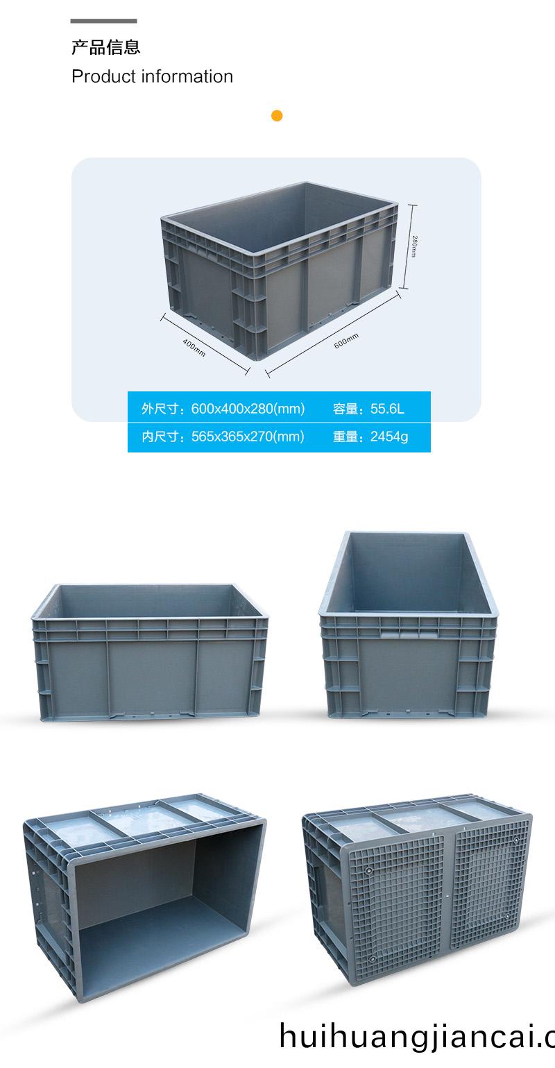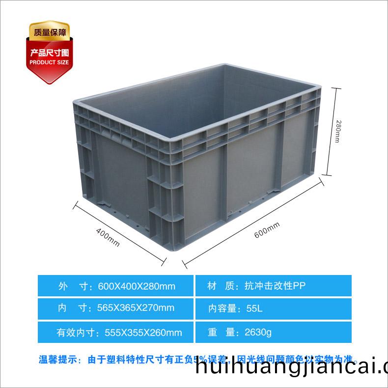 外尺寸(cun):600X400X280mm 內尺寸:565X365X270mm 材質(zhi):抗衝擊改性PP 重量(liang):2.6kg